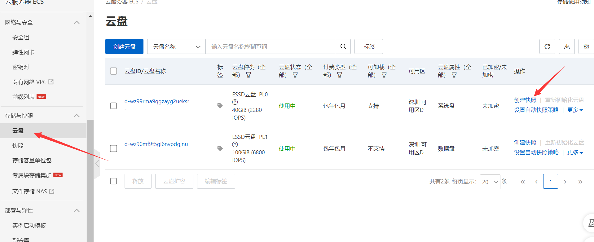 选择云盘这边,操作C盘执行快照,这个创建永久的快照C盘