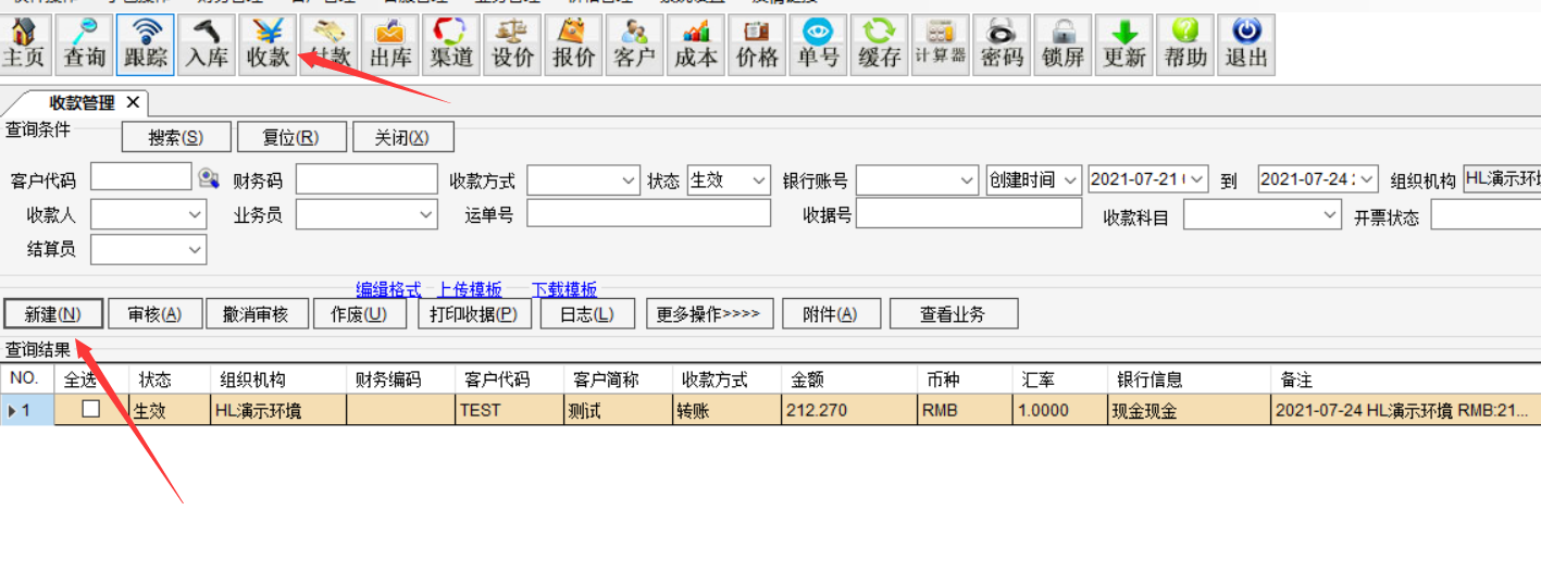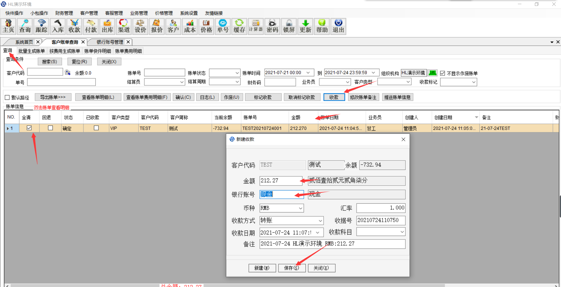华磊系统——财务管理————客户账单查询————搜索出客户未出的账单————选中客户————右边勾选对应的单号————生成收款通知单————确认 点击查询———搜索——勾选——导出对应的格式 如果客户转账是转账单金额的全部的,可以这样按账单金额收款,我们会标记已收款 如果客户不是付款账单全部金额的,只付了部分款,只能用收款图标做收款,这种收款不标记账单和单号。