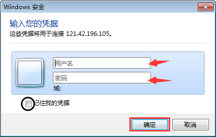 4、在新的窗口输入账号和密码,你可以选择记住密码(记住我的凭据),下次用你的电脑打开就不用输入密码了,输入完了点确定