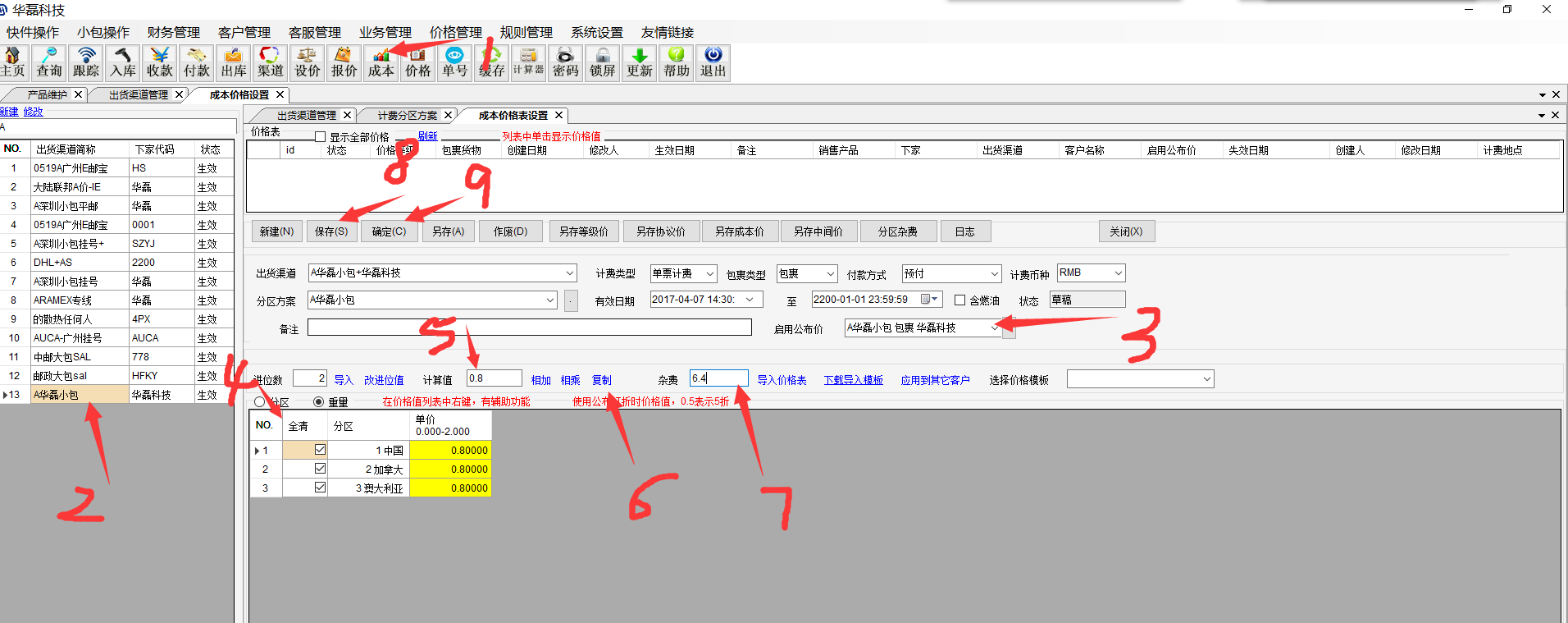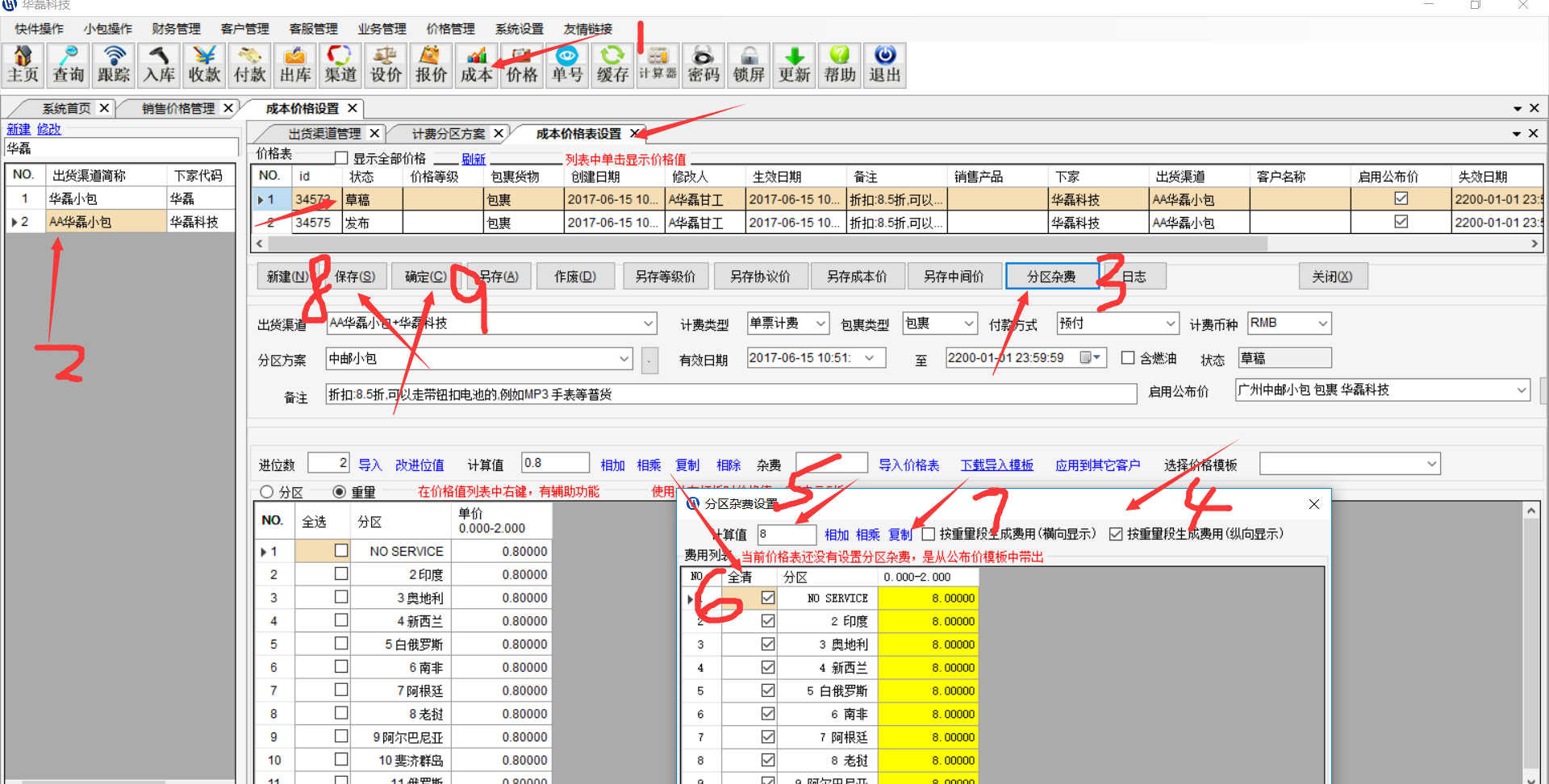 新建产品的出货成本 如果是有不同的分区杂费的,设置在下面这个位置,公布价带过来的杂费要进来保存才生效,杂费可以复制粘贴进来。如果是杂费要打折的,可以全选,乘以折扣。杂费只能是这个价格表草稿状态才能修改。