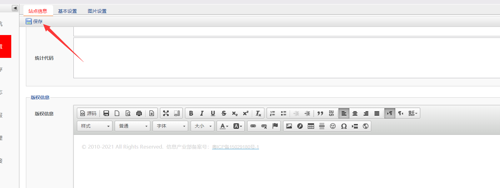 登陆官网后台控制台,找到下面箭头对应的位置,添加对应的备案号,绑定备案局的超链接 https://beian.miit.gov.cn 之后再保存