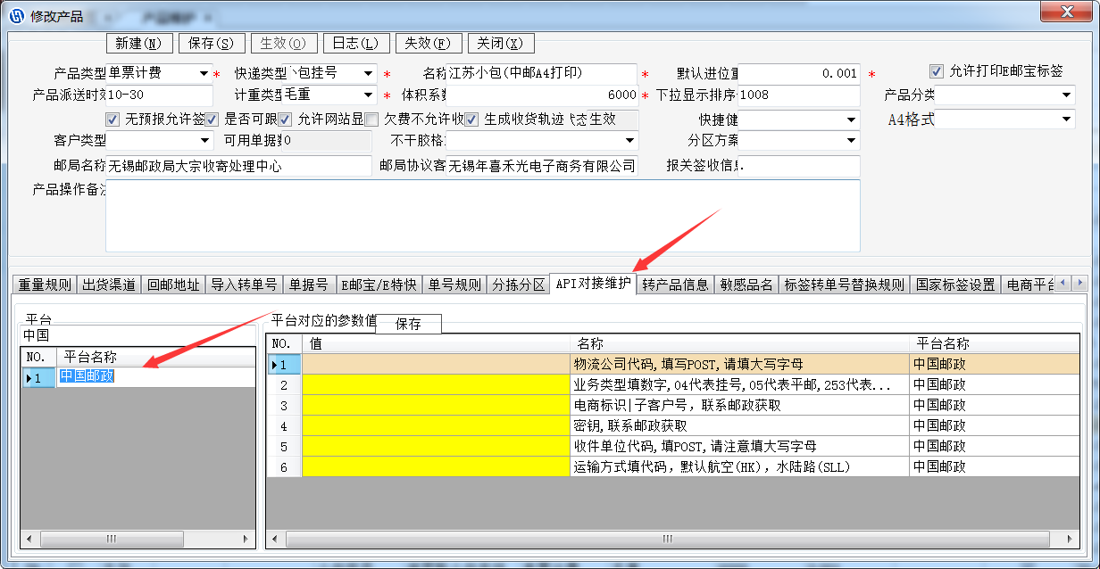 1.系统设置–产品维护里先新增产品,并对接好邮政产品。