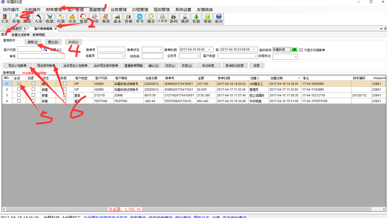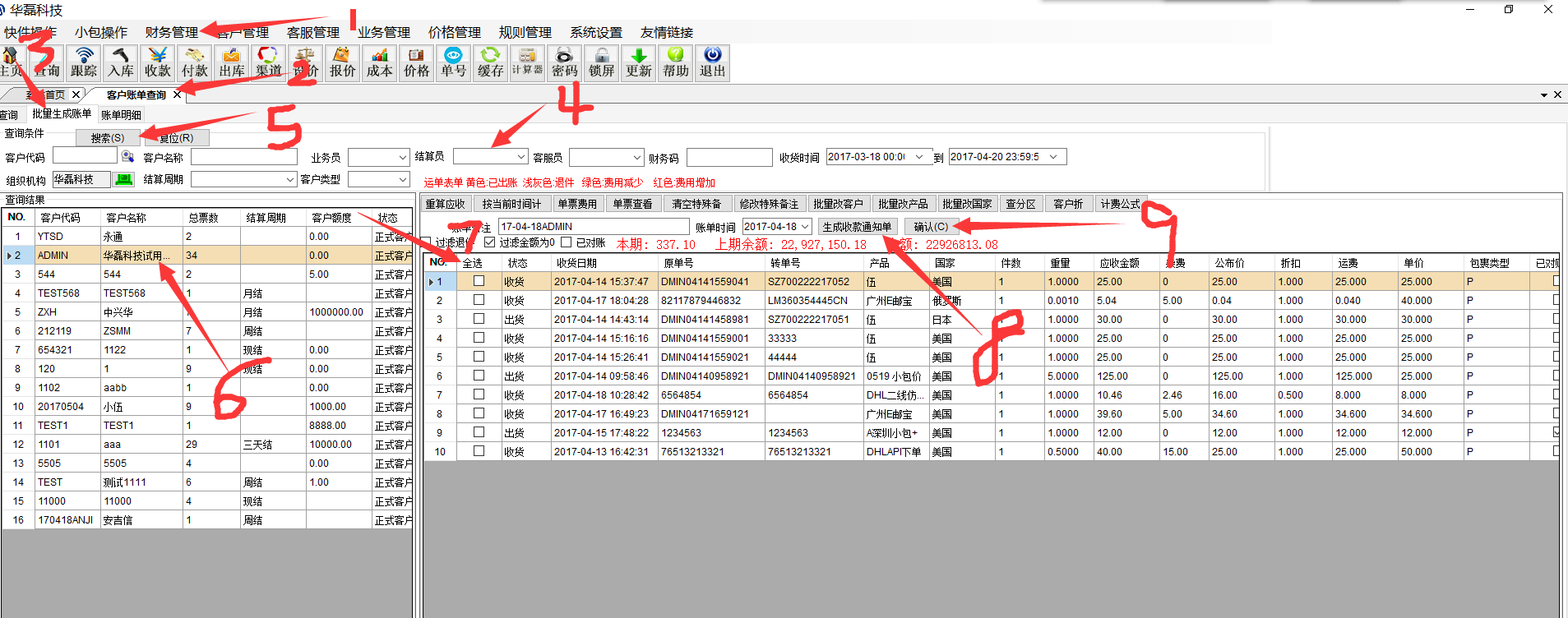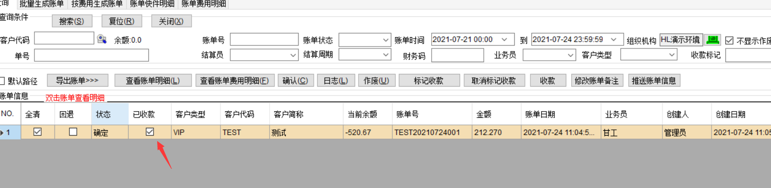 华磊系统——财务管理————客户账单查询————搜索出客户未出的账单————选中客户————右边勾选对应的单号————生成收款通知单————确认 点击查询———搜索——勾选——导出对应的格式 如果客户转账是转账单金额的全部的,可以这样按账单金额收款,我们会标记已收款 如果客户不是付款账单全部金额的,只付了部分款,只能用收款图标做收款,这种收款不标记账单和单号。