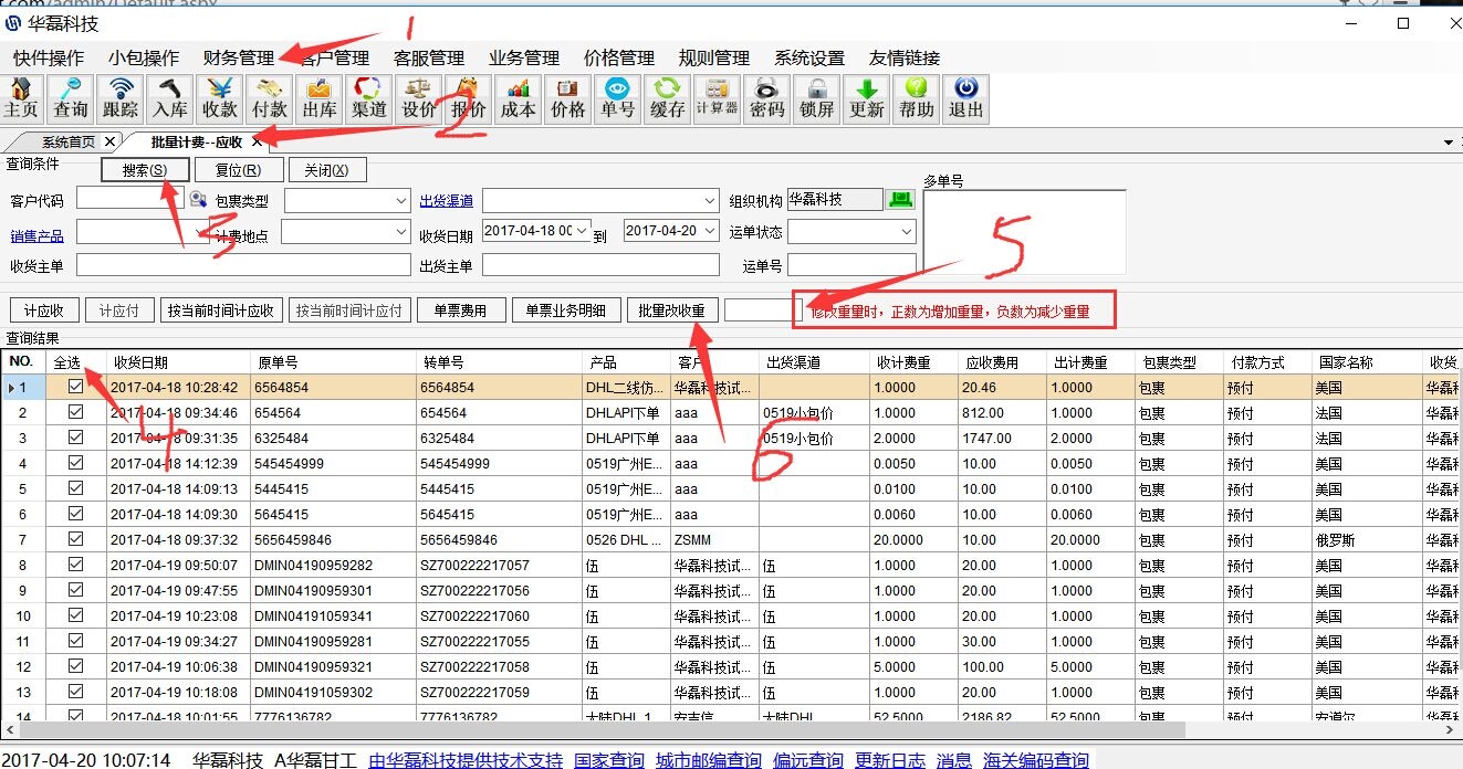 价格管理————批量计费应收————搜索(按对应的条件搜索)————全选————填写重量————批量改收重