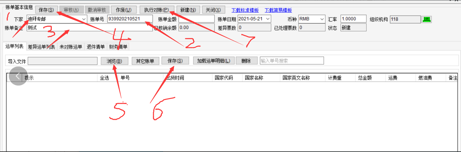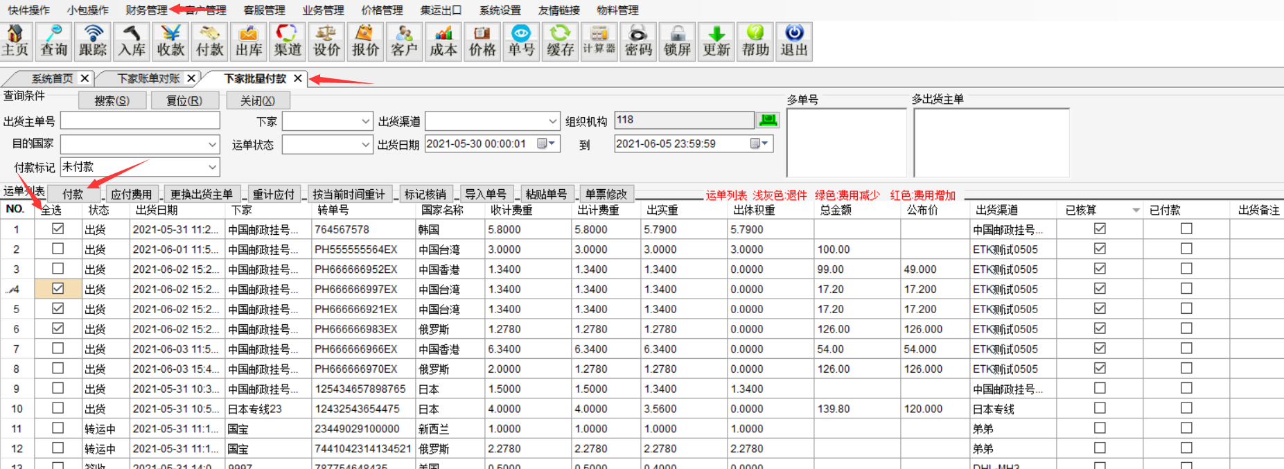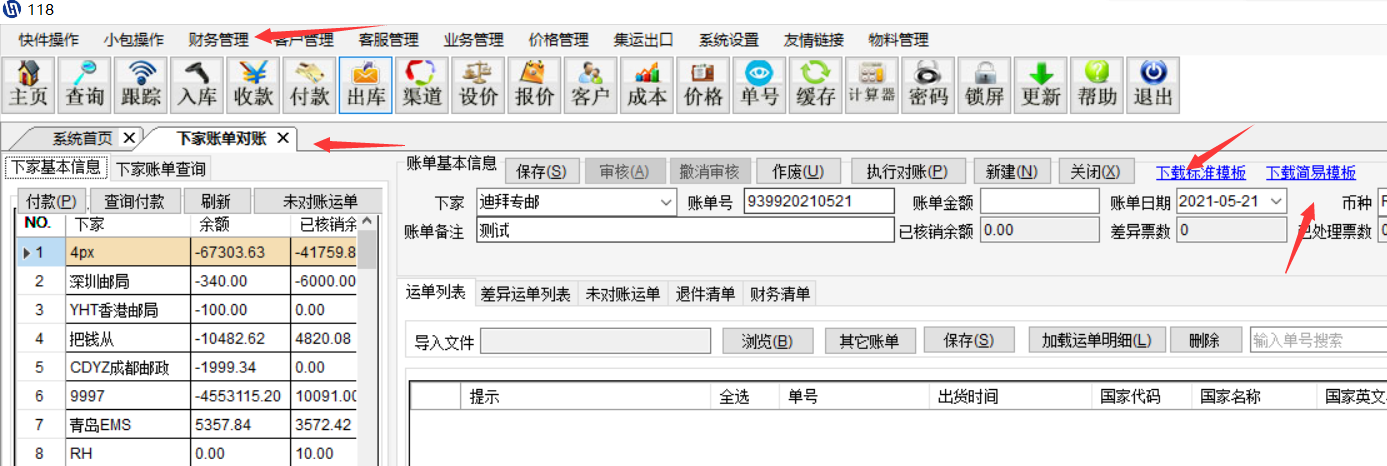 华磊系统——财务管理——下家账单对账———先下载对账模板做好表格,把下家给你的账单复制数据到我们的模板上面。 2,新建选下家——生成账单号(一天多个的可以修改)———备注——点保存————浏览表格———保存————执行对账 3查看差异列表————(有问题的和下家校对)————选中————选对应的情况————保存 4,刷新列表,会显示该账单的应付总金额。(如果是存在多次对账的,只能单独填写对应的实际应付金额) 5.付款给服务商有两种方法, 方法一,直接在付款图标里面新建一笔总的金额,这种方式不关联单号。 方法二,在财务管理,下家批量付款,找到对应对过账的单号,勾选付款对应的金额。