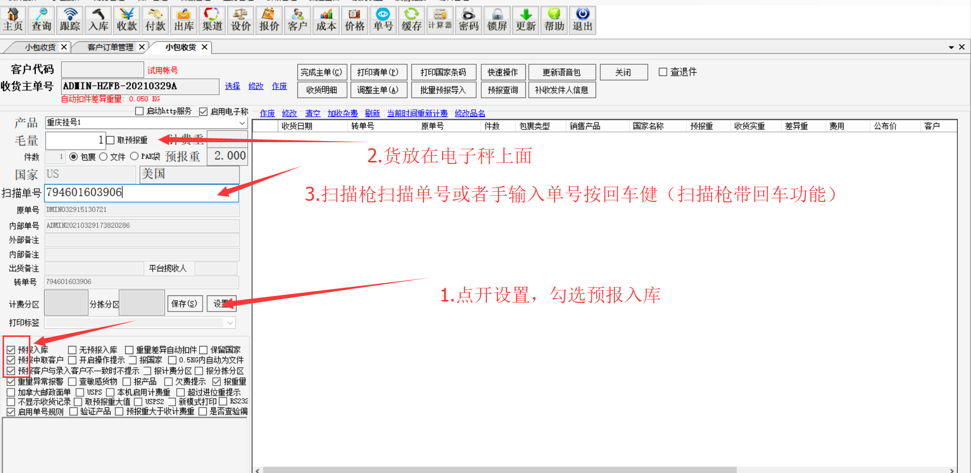 有在网页下单的预报的,看的预报入库 预报入库,点开设置,把 里面的预报的 勾选 图(1.8-3) 当这批次完成后,记得点完成主单; 说明入库其实就是小包操作的收货,主要完成收录清点、核算货物重量、费用应收等作用。 无预报收货,按下图说明 小包操作-小包单票收货如图(1.8-1) 图(1.8-1)
