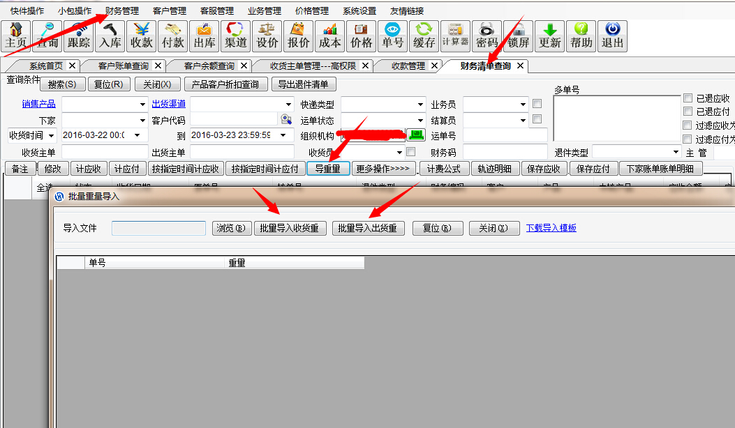 小包操作,快件清单查询,导重量 或者,财务管理,导重量,如图 收货重量和出货重量是分开的按钮,如果两个都要修改,要导入两次,点不同按钮修改,修改计费重,系统会重新计费应收或者应付 如果服务商是华磊系统的,可以点查询服务商的材积重量